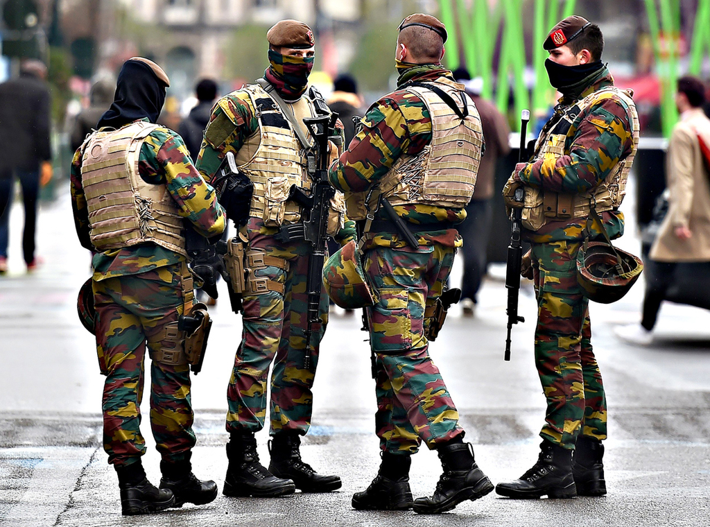 Soldiers patrol in the streets of Brussels as the Belgian capital remains on the highest possible alert level. (Photo: Emmanuel Dunand / AFP)