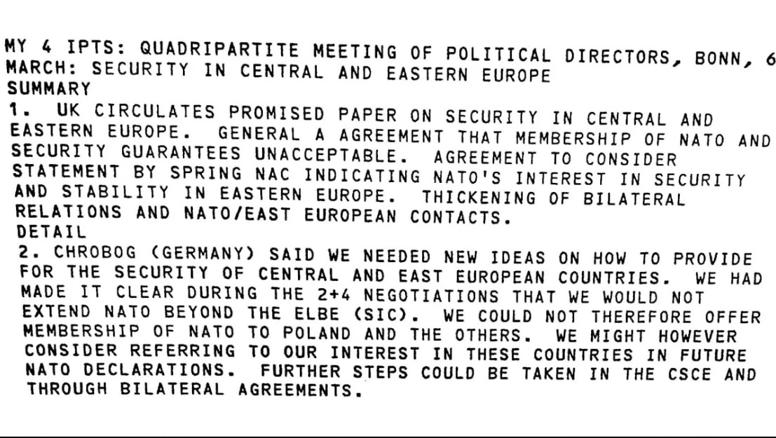 The minutes of a March 6, 1991 meeting in Bonn between political directors of the foreign ministries of the US, UK, France, and Germany contain multiple references to “2+4” talks on German unification in which the West made it “clear” to the Soviet Union that NATO will not expand past the eastern borders of Germany.