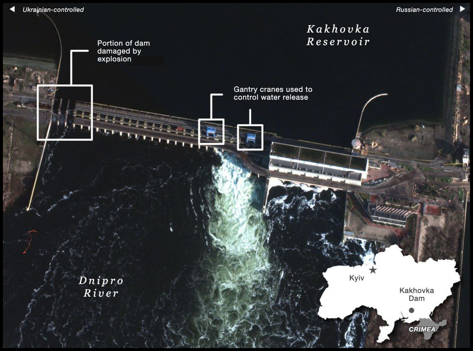 The giant Kakhovka Hydroelectric Power Plant was spectacularly blown up by an explosion or explosions and its vast reservoir began flooding hundreds of cities and villages in the surrounding Kherson countryside. The nearby city of Nova Kakhovka with a population of 45,000 is being evacuated. Aerial images of the deluge show an unprecedented disaster with huge environmental, economic and social repercussions.