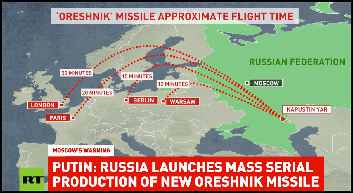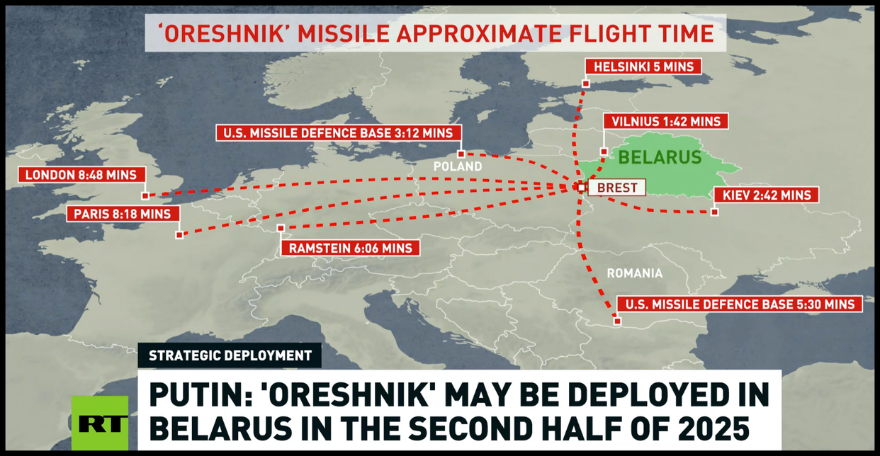After the presidents of Russia and Belarus signed security agreements in Minsk on Friday, Alexander Lukashenko asked Vladimir Putin about obtaining some of Moscow’s cutting-edge Oreshnik (Hazelnut tree) missiles. Putin said that the missiles could be deployed in Belarus in the second half of 2025, when the system fully enters service. Oreshnik missiles are capable of carrying kinetic warheads that strike at hypersonic speeds, that is up to Mach 10. Russia has already placed nuclear weapons in Belarus and expanded its nuclear protection to include Belarus as part of their Union State partnership.