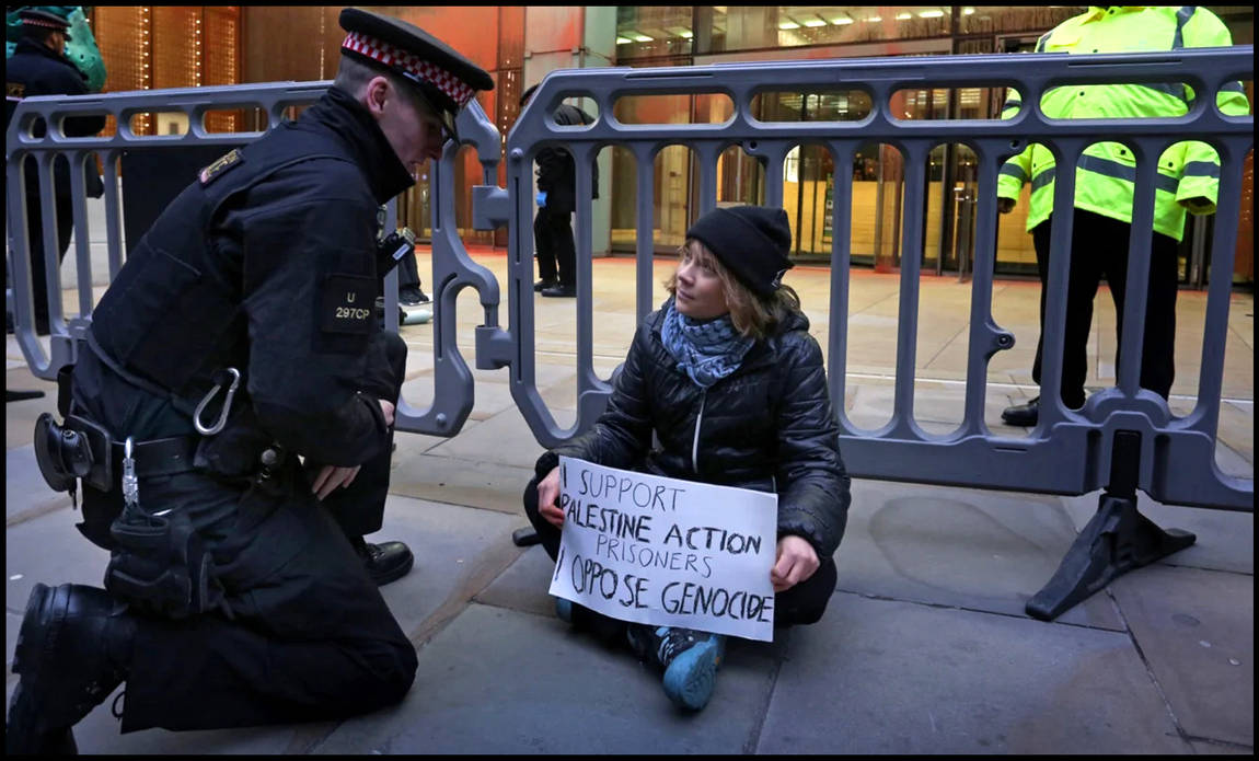 City of London Police said a woman, 22, had been arrested for displaying a placard in support of proscribed organisation, Palestine Action, contrary to Section 13 of the Terrorism Act 2000.